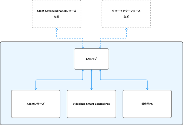 今回は青枠内での構成をご説明いたします。LANハブを挟んで分配しているためBlackmagic Design社製のコントロールパネルや社外製タリーインターフェースなどの拡張も可能です。LANハブにWi-Fiアクセスポイントを加えると無線接続でATEMやVideohubのコントロールが可能になります。iPadなどから操作もできるので仕込み時などにステージからサブにあるATEMを操作したりと実に便利です。