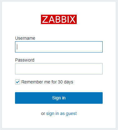 初期設定が終了すると、Zabbixのログイン画面が表示されますので、初期ユーザーでログインします