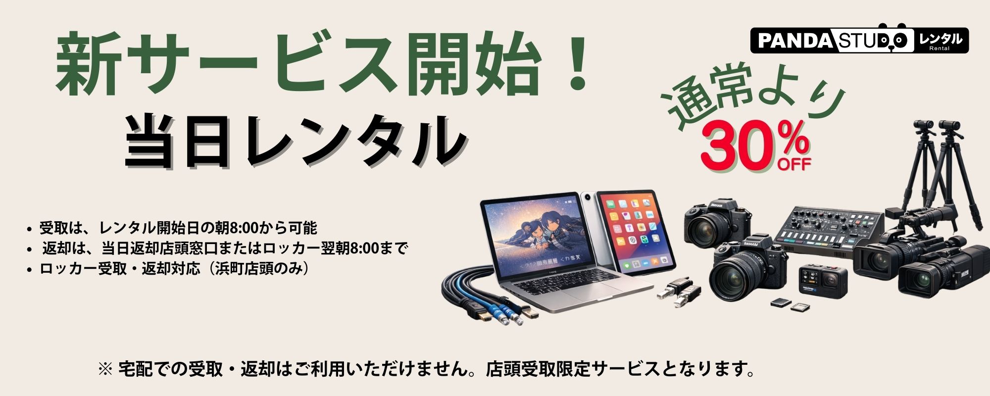 2026年3月3日より、パンダスタジオレンタルの新サービス「当日レンタル」がスタートしました。急な撮影やイベント、機材トラブルなど「今日すぐ借りたい」に対応する、店頭受取限定の特別プランです。 当日レンタルとは!パンダスタジオ当日レンタルは、店頭受取限定で通常の1日レンタル価格より約30%OFFでご利用いただける特別サービスです。 当日レンタルのポイント