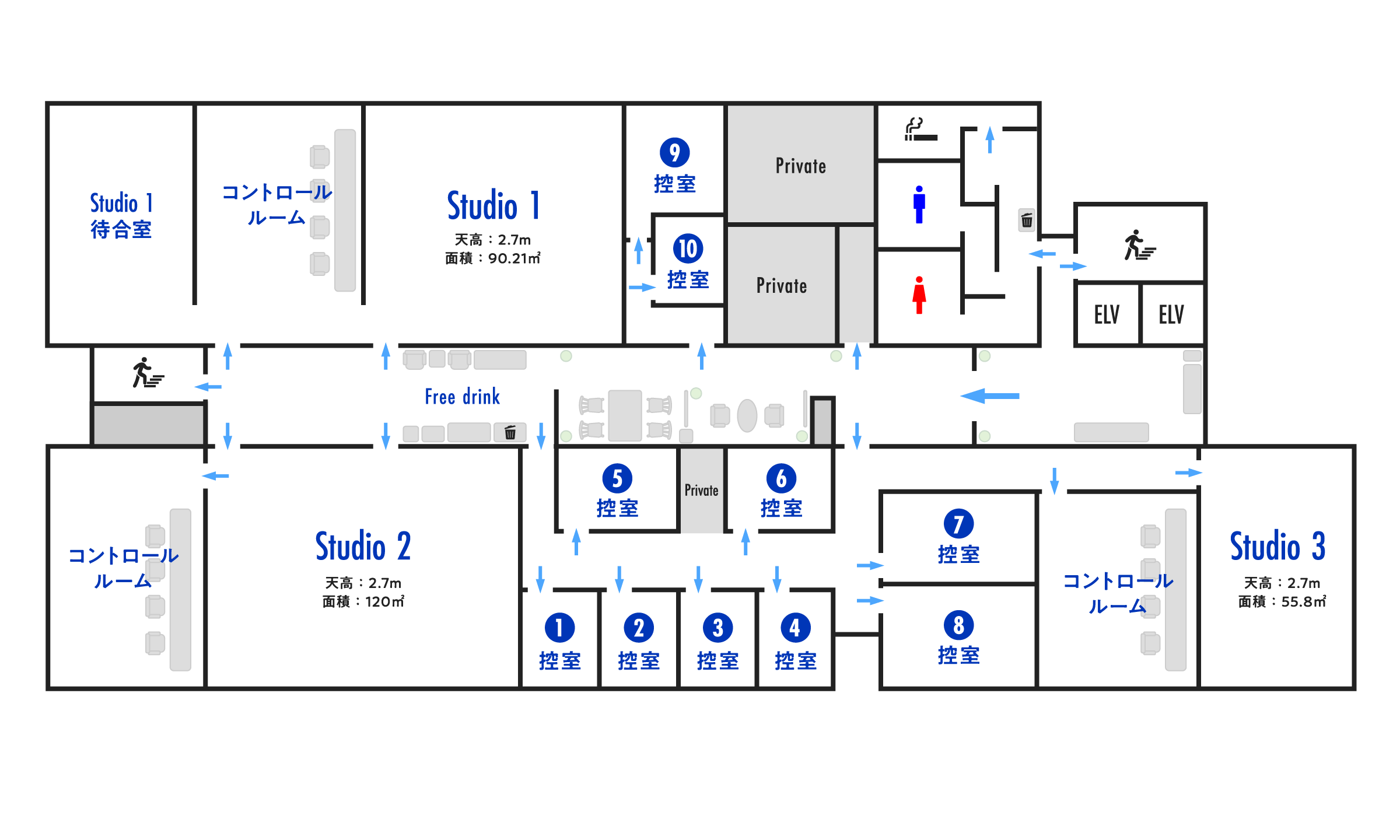 喫煙室や飲料自販機は、スタジオから出てエレベーターの手前左手トイレの奥のリフレッシュコーナーにございます。