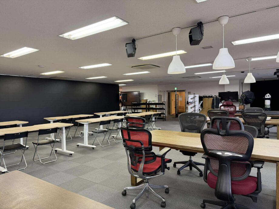 - 超巨大LED+最大100名を収容可能なセミナースペース。LED+最大50名のPCやカメラの実技講習スペース(作業机と椅子をご用意)